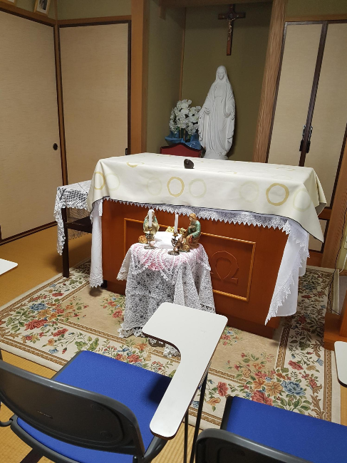 문을 열고 들어가면 평범한 가정집 현관으로 이어집니다. 어둑어둑한 복도에서 신발을 벗고 있으면, 안에서 신자인 듯 보이는 분들이 나와 무슨 일로 왔느냐고 물어봅니다. 서너 분의 할머니와 한두 분의 할아버지, 그리고 아주머니가 한 분입니다. 노령화 문제가 심각한 일본 천주교회의 특성상, 못 보던 젊은 사람이 성당에 들어선다면 새삼스러워하는 반응을 마주하는 것이 일반적입니다. "미사 참례를 하러 왔습니다"고 이야기하니 모두들 반가워합니다. 한 분 섞여 있던 아주머니가 성가책과 주보가 놓여 있는 선반을 보여 주고, 경당으로 안내해 주십니다. 이 경당이란 것이 또 한국 사람에게는 특이한 경험입니다. 한국에서 신자 생활을 하는 대부분의 천주교도라면 아마 이곳에서 보는 경당이야말로 일생 본 것 중 가장 작은 경당이 되지 않을까 싶습니다.