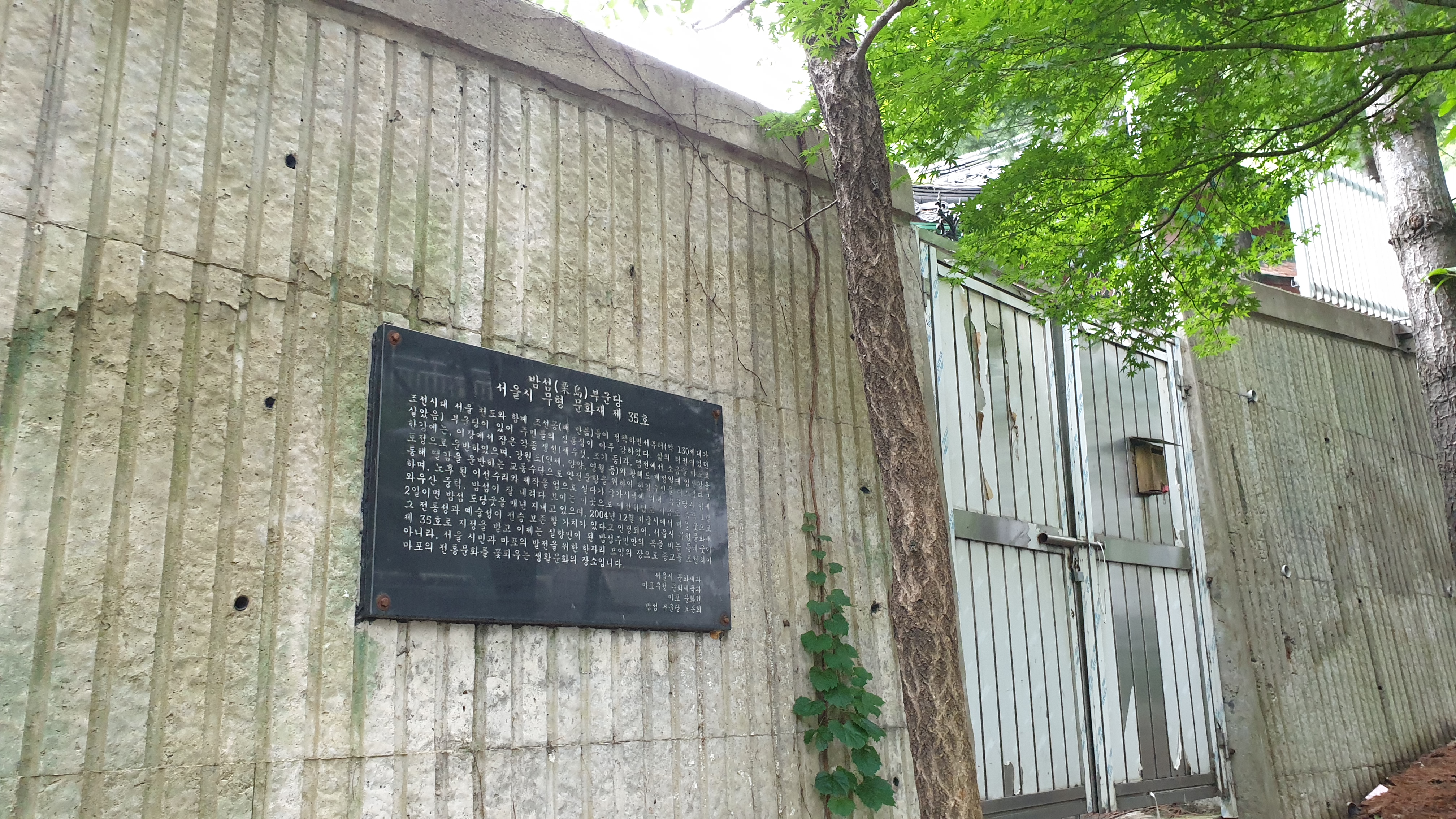 공민왕사당도 광흥창역에서 산비탈에 걸린 골목길을 따라 조금 올라가야 하는데, 부군당은 더 많이 올라가야 했다. 그래도 이 구역이 전부 대규모 아파트단지로 재조성된 덕분이라고 할까, 길이 제법 정비되어 있어 더운 날씨에도 불구하고 올라가는 것이 그다지 어렵지는 않았다. 와우산 바로 밑에 있는 창전동래미안아파트 단지 안으로 들어가 111동 건물 옆으로 들어가면, 멀끔하게 정비된 수도권 특유의 아파트 단지와는 영 어울리지 않는 콘크리트 담벼락과 철문이 눈에 들어온다. 퍼뜩 봐서는 이게 도대체 무슨 시설인지 도저히 알 수 없다. 아마 이 아파트에 사는 대부분의 주민들도 알지 못하리라.