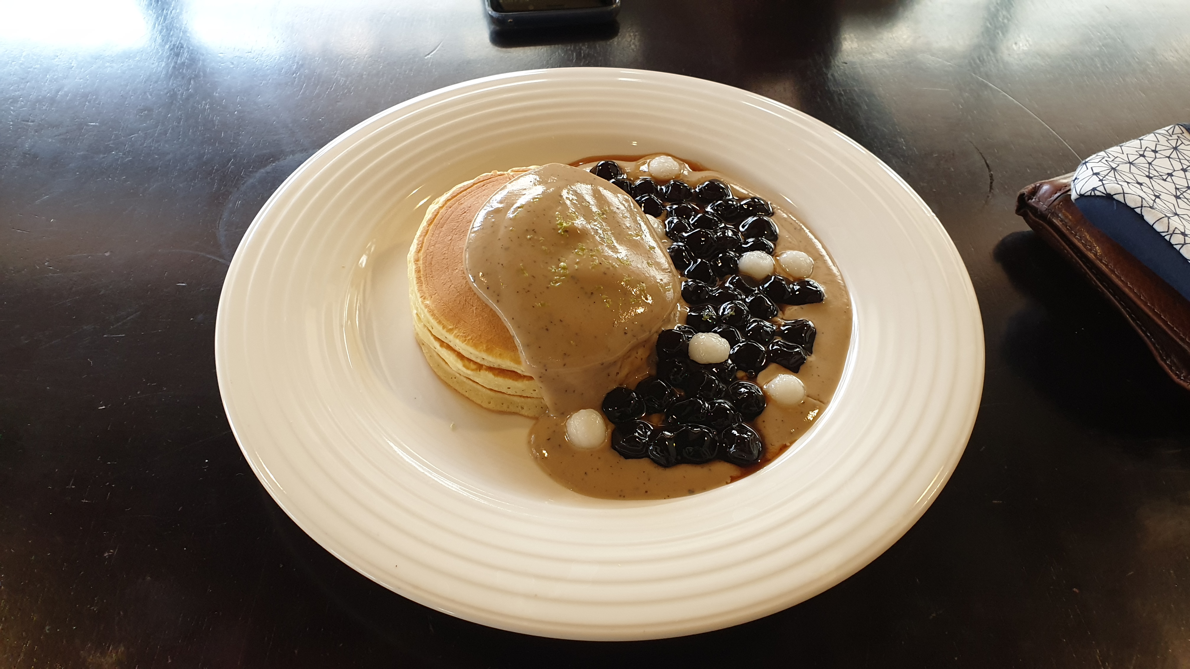 옛 일제강점기의 정취가 물씬 풍겨나는 분위기의, 퍽 정갈한 느낌의 카페였다. 예전에 일본식 요정料亭으로 쓰이던 건물을 1층은 창고로, 2층은 카페로 리모델링해서 사용하고 있는 건물이다. 한 블럭만 나가면 사람들로 와글와글한 시내인데, 이곳은 마치 시간이 멈춘 듯 고요하고 호젓한 느낌이 들었다. 손님도 간간이 앉아 있는 현지인들과 일본인 몇 정도밖에 없었다. 메뉴를 받으면 색연필로 먹고자 하는 메뉴 옆에 표시를 해서 돌려주는 시스템인데, 처음부터 궁금했던 버블밀크티 소스를 얹은 팬케이크와 함께 차가운 우롱차 한 잔을 시켰다. 팬케이크는 딱 상상 가능한 '단 것 위에 단 것을 얹은' 맛이었고, 우롱차는 차가우면서도 깊이 있는 맛이어서 무척 반가웠다.