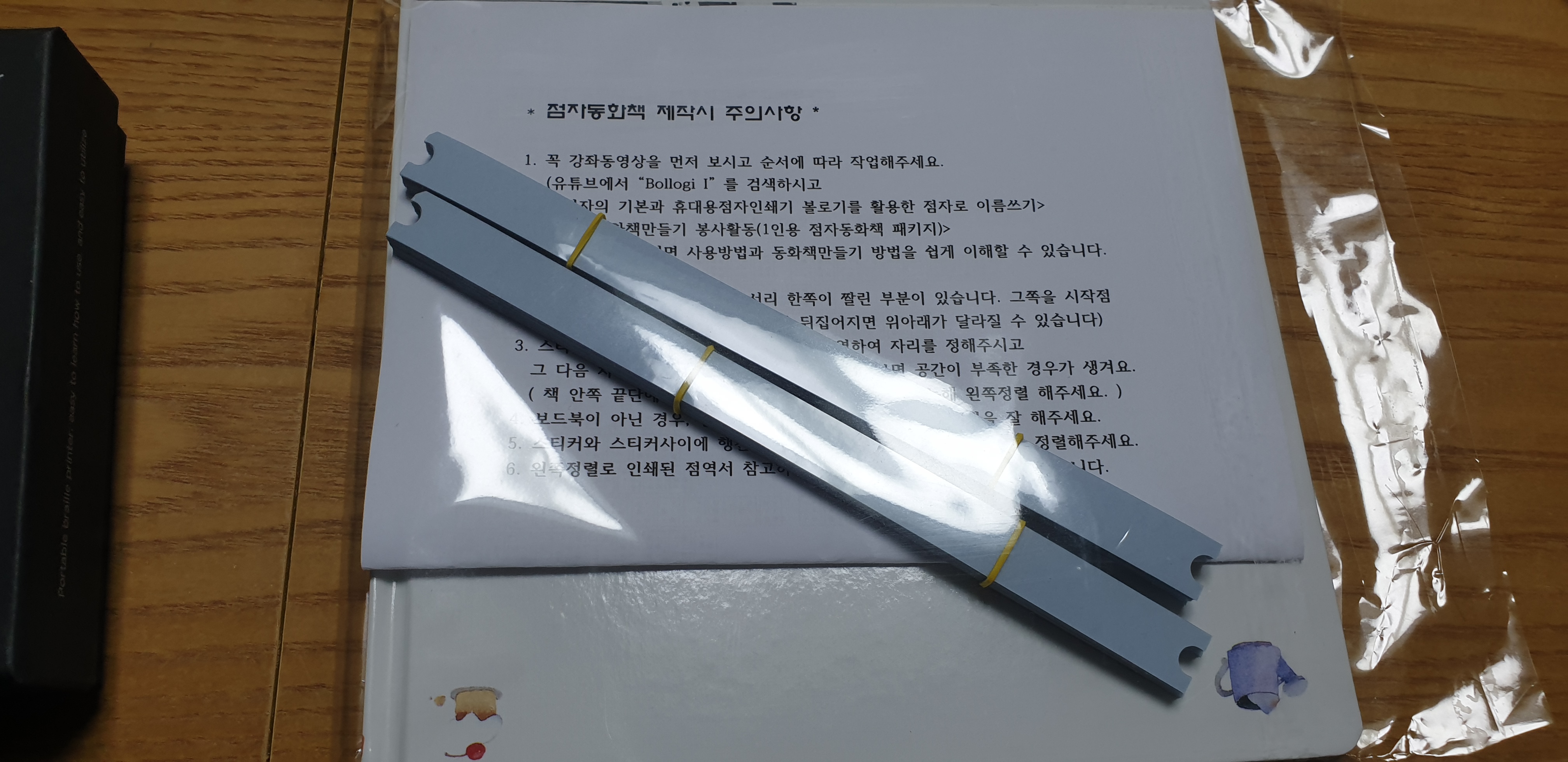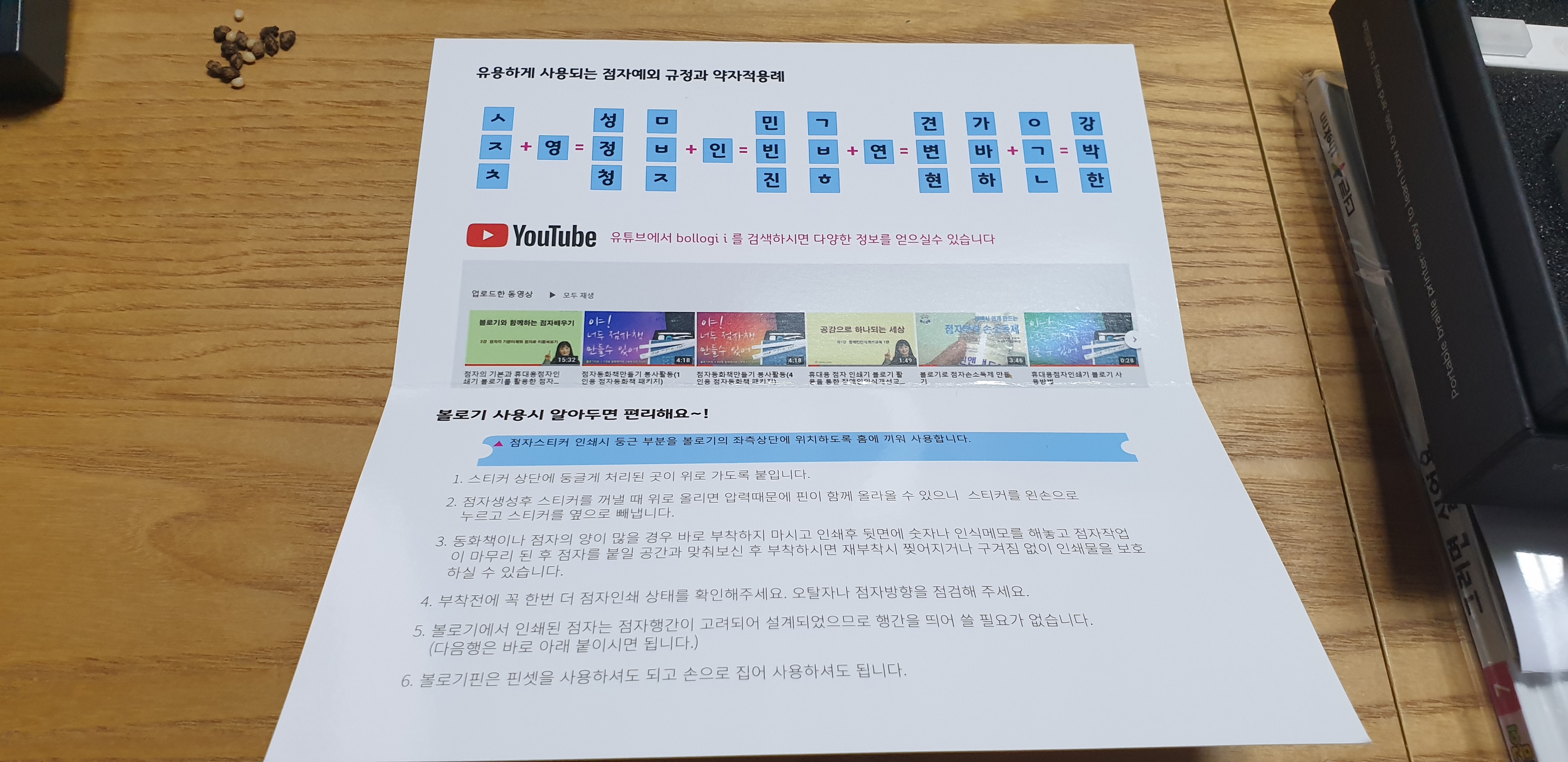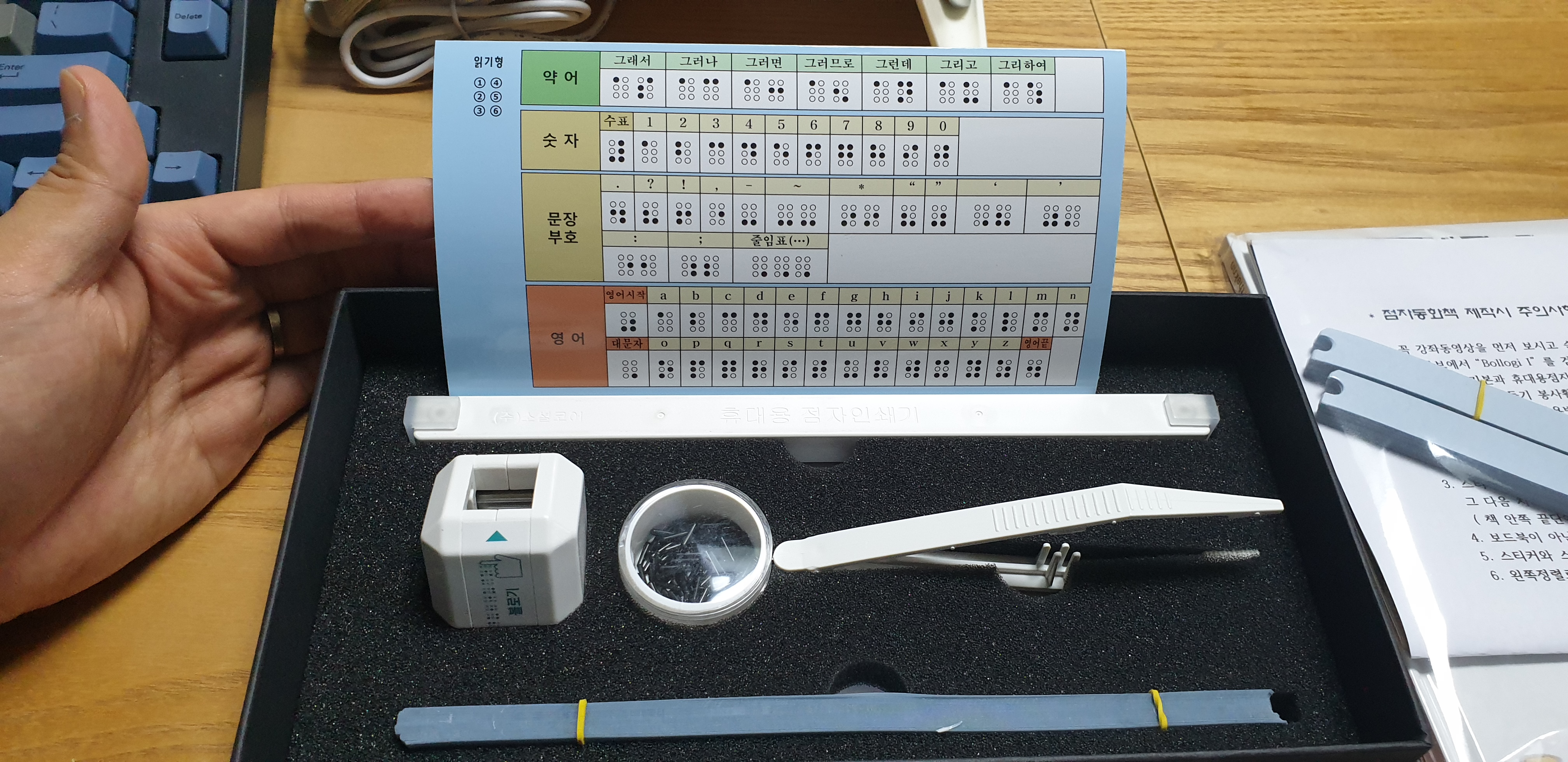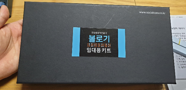 '볼로기 임대용 키트'라고 되어 있는 상자 뚜껑을 열면, 점자 일람표와 휴대형 점자 인쇄기, 활자용 핀과 핀셋, 그리고 점자 인쇄에 쓰이는 스티커필름이 한 묶음 들어 있다. 점자가 인쇄되면 볼록하게 올라오기 때문에 이름이 '볼로기'인 모양이다. 귀여워.