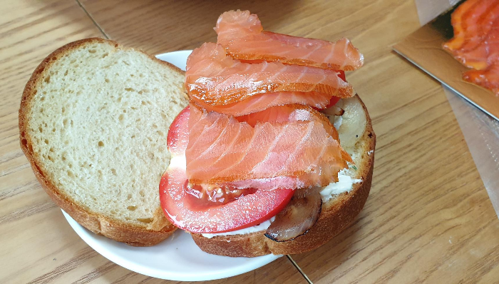 다음은 콜드스모크 연어. 구워 뒀던 바게트빵은 파테와 함께 순식간에 사라져 버렸으므로, 이번에는 평범한 식빵을 구워 준비했다. 아내가 양파를 채썰어 볶아 준비하고, 실리제롬의 레몬딜 크림치즈를 바른 빵 위에 볶은 양파, 토마토, 연어를 층층이 쌓아 샌드위치를 만들었다.