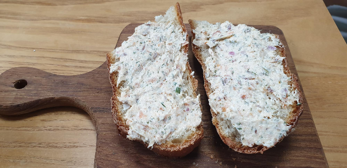 사진만 보면 완전히 두껍게 치덕치덕 바른 것처럼 보이지만, 생각보다 훈제 향이 상당히 강하므로 그렇게 많이 발랐다간 한동안 입에서 연기 냄새가 가시지 않을 것이다(맞다, 사실 처음 먹을 때 그렇게 발랐다가 깜짝 놀랐다). 강렬한 훈연향에 이어 연어 특유의 부드러운 고소함, 그리고 잘게 잘린 야채들의 향기가 같이 올라오면서 무척 기분 좋은 한 입 식사거리가 된다. 크래커에 얹어 카나페로 먹어도 좋을 듯하다. 맥주 안주로는 더할 바가 없을 테지만, 아침 식사만으로도 벌써 훅훅 사라지고 있다.