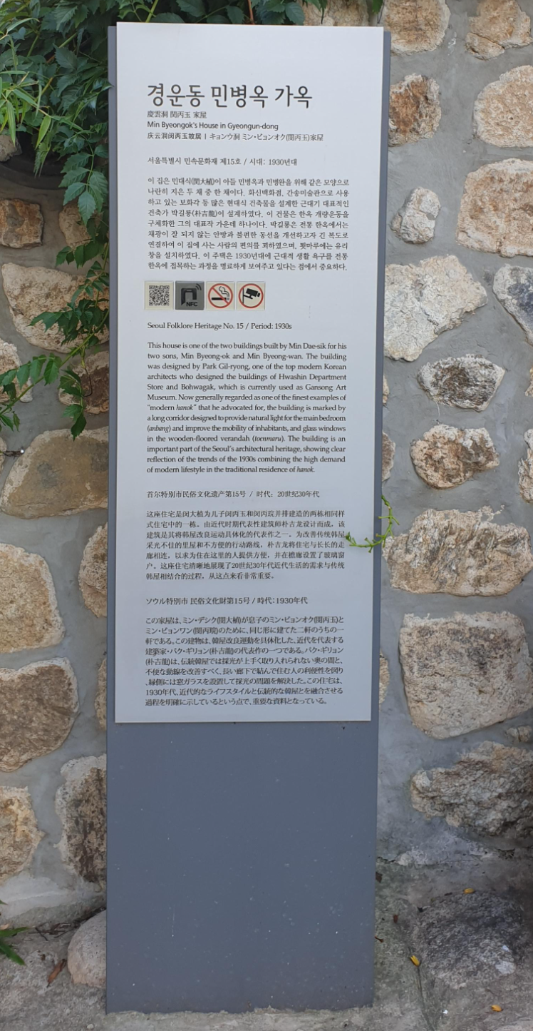 천도교 중앙대교당 앞으로는 웬 고풍스럽지만 나름대로 관리는 되어 있는 듯한 한옥 한 채가 슬그머니 고개를 내밀고 있다. 경운동 민병옥 가옥이라는 곳이란다. 친일파 민영휘의 아들 민대식이 그 아들 민병옥에게 주기 위하여 당대 조선 근대건축의 비조인 박길룡에게 의뢰하여 지은 집으로 최근까지 한식당으로 이용되었다고 한다. 과연 조선 근대건축의 비조에게 의뢰한 만큼, 겉으로는 평범한 한옥으로 보이지만 사실은 당시 막 서양식으로 개량되기 시작한 한옥의 모습을 보여 주는 대표적인 문화재라고. 이를테면 화장실을 실내에 단다든가, 툇마루에 유리창을 단다든가 하는 식이다. 오늘날 우리가 듣기에는 퍽 자연스럽게 들리지만, 1930년대만 하더라도 저으기 혁신적인 시도였을 것이다. 사유지이기라도 한지 문은 굳게 닫혀 있어 내부를 들여다보기는 어려웠다.