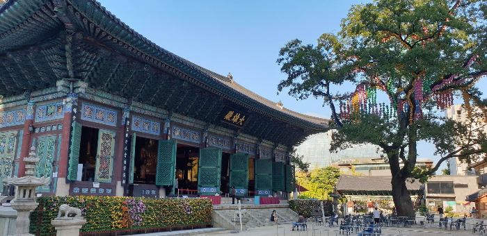 국내에서 이처럼 덩치가 큰 목조 건축물을 본 적이 있는가? 아마 그리 쉽지만은 않을 것이다. 당연하다. 조계사 대웅전은 단층 목조 건축물로는 우리나라에서 가장 큰 건물 중 하나이기 때문이다. 다만 그리 역사가 긴 건물은 아니다. 본래 증산도 계열인 보천교의 총본부 '십일전'이었던 것을 보천교가 망하면서 헐값에 사들여 이리로 옮겨 세우고 불교적인 건물로 용도변경한 것인데, 그런 탓인지는 몰라도 우리가 흔히 아는 절집 대웅전의 모습이라기에는 차라리 왕조의 궁궐을 연상케 한다. 전각 안에 모셔진 삼존불 또한 어마어마한 크기를 자랑하기 때문에 살짝 들여다본 사람은 위압감을 느끼기에 충분하다. 대웅전 앞에 우뚝 서 있는 400년 넘은 회화나무나 대웅전 오른쪽에 고고하게 서 있는 500년 넘은 백송이 이 풍경과 어우러져서 불자들뿐 아니라 이곳을 찾는 뭇 시민들에게 주는 웅장함은 엄청나다. 이 백송 때문에 이 동네 이름이 '수송동壽松洞'이 될 정도니 정말 오랫동안 서울 사람들에게 큰 의미로서 자리잡아 온 셈이다.