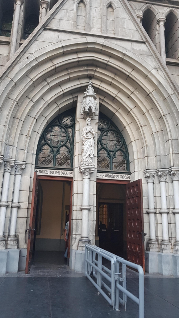 적벽돌 외벽으로 되어 있는 명동성당과 달리, 자카르타 대성당의 외벽은 회벽으로 되어 있습니다. 다녀 본 오래 된 성당들 가운데에서는 도쿄 치요다의 칸다 성당과 유사한 느낌을 줍니다. 성당 정문으로 들어가는 길에는 이 성당의 주보성인인 성모 마리아의 상이 조각되어 있고, 문 위에는 루카복음 1장 48절의 '이제부터 과연 모든 세대가 나를 행복하다 하리니Beatam me dicent omnes generationes'라는 구절이 고딕체로 새겨져 있습니다. 마리아가 엘리사벳의 문안인사를 받고 이에 답하는, 이른바 '마리아의 노래'의 한 구절입니다.