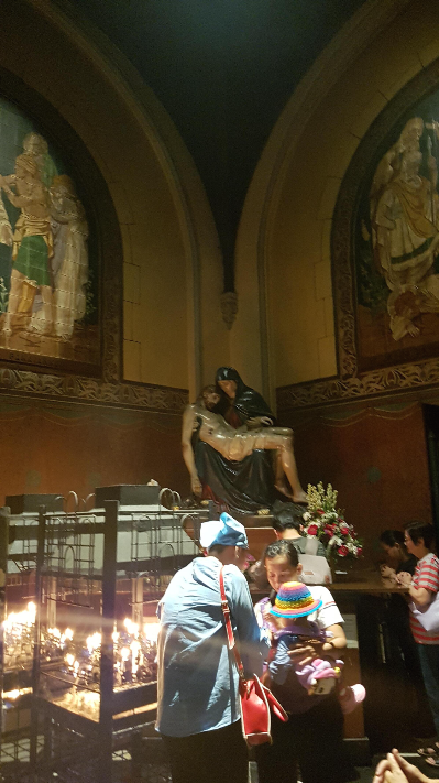 예배당 문을 들어서면 바로 맨 오른쪽 뒤 구석에, 그리스도교 신자가 아니더라도 미술에 흥미가 있는 사람이라면 한 번쯤 봤을 법한 느낌의 조각상이 서 있습니다. 십자가에서 내려진 예수의 시체를 성모 마리아가 안고 슬퍼하는, '피에타'상입니다. 미켈란젤로의 조각상이 워낙에 유명하기는 하지만, '피에타'라는 주제 자체는 미켈란젤로뿐 아니라 많은 이들이 작업해 왔고 지금도 작업되고 있는 주제입니다. 자카르타 대성당의 피에타 상도 무수히 많은 피에타 상들 중 하나겠지요. 재미있게도 이 앞에 기도초를 봉헌할 수 있는 공간과 함께, 아이를 안은 어머니들이 그렇게들 많이 기도를 하러 와 있었습니다. 모르긴 몰라도 자카르타 대성당의 피에타 상이 이 지역의 가톨릭 신자들에게는 '젊은 어머니들의 기도처'로 유명한 모양입니다.