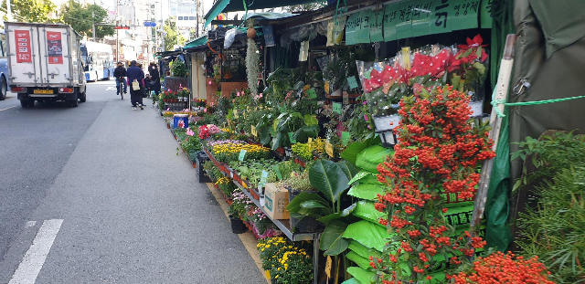 흥인지문에서 광화문 방향으로 종로를 따라 걷다가 갑자기 오른쪽을 한번 훅 돌아보면 정말 특이한 광경이 눈에 들어온다. 재미있게도 자동차가 씽씽 오가는 4차선 도로에, 그것도 한 차선을 떡하니 차지하고 길가를 따라서 화훼 좌판이 쫙 늘어서 있다. 가을이라 그런지 국화 종류의 화분이 대부분을 이루고 있지만, 다른 계절에는 또 다른 식물이 많이 꽃피운 채로 손님을 기다리고 있으리라. 이곳이 종로꽃시장이다. 종로41길 거리를 따라서 200미터 남짓, 실외에 무척 자연스레 형성되어 있는 퍽 원시적인 형태의(부정적인 의미는 아니다) 시장이라는 생각이 들었다.