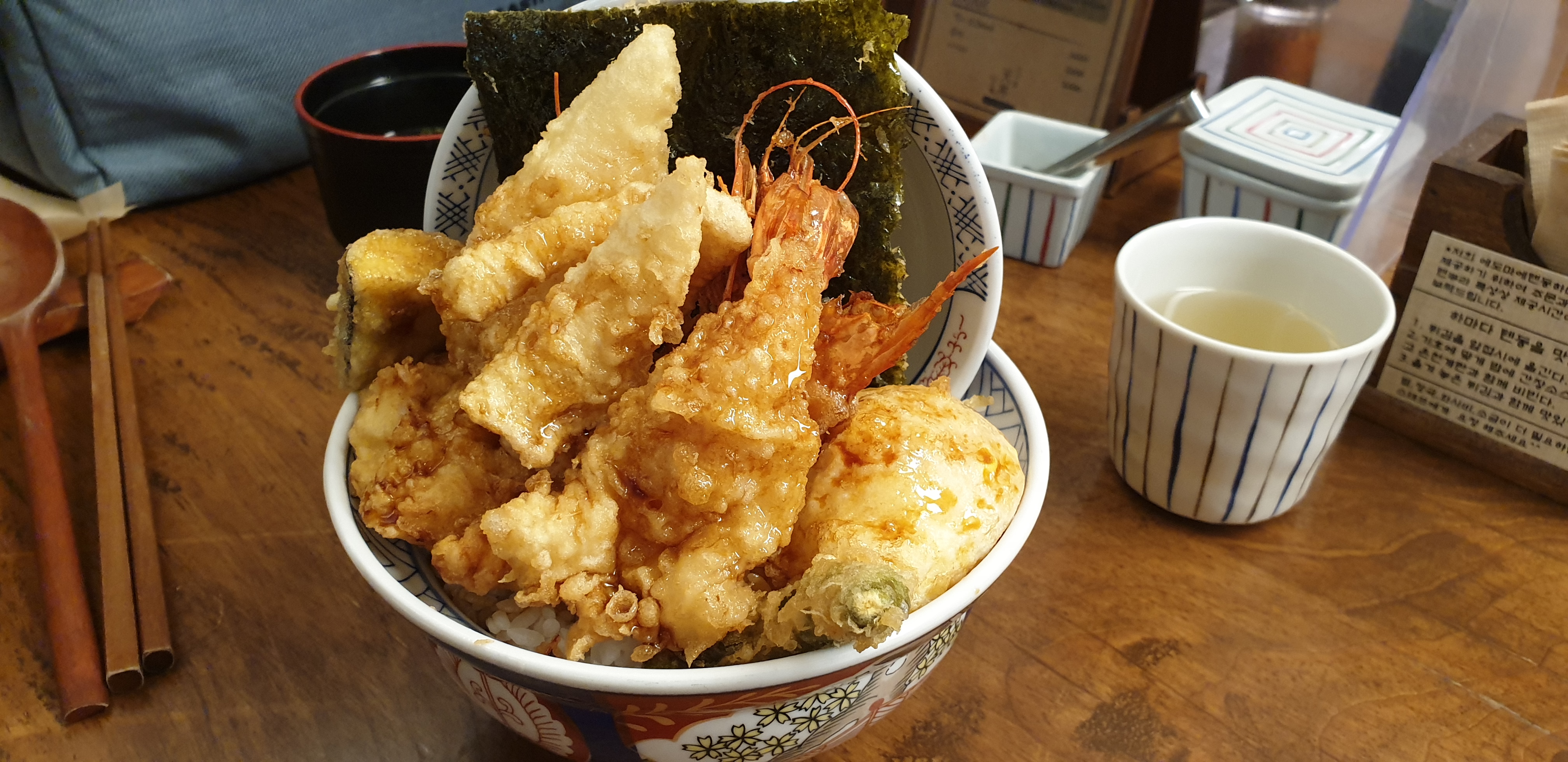 다른 재료들의 튀김도 뭐라 더 말할 필요 없이 멋들어졌다. 텐동에 올라가는 튀김은 파삭파삭하기보다는 바삭하면서도 살짝 부드러운 느낌을 내어 소스가 잘 배어들도록 하는 것이 관건이라고 생각하는데, 바로 그 관건이 잘 지켜진 튀김들이었다. 추가 단품메뉴로 시킨 가지 또한 바삭바삭한 튀김옷 밑에 숨어 있는 가지 특유의 촉촉한 느낌이 부담감 없이 잘 어울렸다. 그러나 무엇보다도 내가 감동한 것은 밥의 질이었다. 사 먹는 밥이 이렇게 향기롭고 고소할 일이 있나? 텐동이란 겉보기에는 튀김이 가장 화려한 역할을 차지하는 것처럼 보이지만, 그 모든 것들도 아래에 깔리는 밥과 소스가 맛없으면 말짱 꽝인 셈이다. 부담감 없는 소스와 딱 어우러지는, 고소하고 달달하기 짝이 없는 흰쌀밥이 정말 절묘했다.