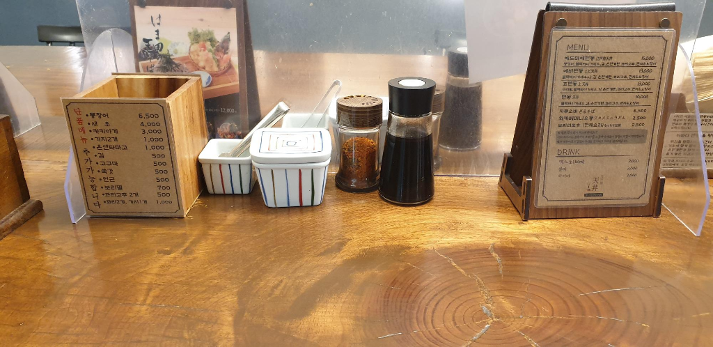 반지핫방에 있는 가게로 들어서면 테이블석 몇 개와 카운터석 몇 개가 있고, 카운터석에는 모두 아크릴 칸막이가 쳐져 있다. 메뉴판을 들여다보며 세상에서 가장 진지한 사람들인 양 고민에 고민을 거듭하는 이 순간이 참을 수 없을 만큼 즐겁다. 음식을 먹고 나면 되려 아쉬워지게 되는 일도 있다는 사실에 비추어 볼 때, 음식점에 들어갔을 때 '가장 즐거운 시간'까지는 아니더라도 '평균적으로 가장 만족도가 높은 시간'이 바로 메뉴를 고를 때가 아닐까 싶다. 아내는 나보다 식사량이 적기도 하고, 기름진 생선을 그다지 선호하지 않기 때문에 죠(상)텐동을 한 그릇, 나는 간만에 붕장어 텐동이 먹고 싶어 붕장어가 들어간 '에도마에텐동' 한 그릇을 시켰다. 단품 메뉴를 무엇을 시킬까 퍽 고민한 끝에 가지까지 주문했다. 다른 튀김도 하나같이 맛있어 보였지만, 아무래도 이런 튀김집에 오면 가지는 꼭 한 입 시켜먹어 보게 된다.
