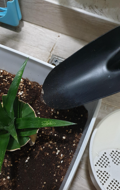 어느 순간부터 겉잎이 하나씩 말라서 꼬부라지길래, 무슨 일인가 싶어 증상을 찾아보니 과습으로 이파리가 무르는 거란다. 식겁해서 당장 세탁실에 데려다 놓고 모종삽으로 흙을 찔렀다가 빼 보니, 한 달도 전에 물을 줬던 화분이 아직도 축축하다. 이 날 무척 참담한 기분으로 이파리 여러 장을 뜯어 버리고 화분도 작은 것으로 갈아 주었다. 알고 보니 기존에 쓰던 큰 화분은 설계가 영 이상하게 되어 아무리 해도 바닥에 물이 충분히 빠지지 않는 구조로 되어 있는 탓이 컸다. 화분을 크게 쓰면 과습이 오기 쉽다더니, 뼈저리게 그 사실을 깨닫게 되었다.