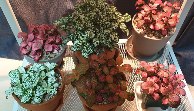 피토니아가 참 좋다. 조금 시든다 싶으면 물을 듬뿍 주면 금방 살아나고, 빛을 그다지 받지 않아도 잘 자라고, 무엇보다도 예쁘다. 모양새와 색깔이 무척 다양하기 때문에, 마치 좋아하는 만화책을 사다 모으듯이 새로 만난 피토니아 품종을 사 모으는 재미가 있다. 가격도 저렴하기 때문에 부담이 없다(물 주는 부담은 있지만). 서울식물원에서 처음 만나 사들인 레드스타(사진 제일 오른쪽 위)로부터 시작해서 핑크스타, 오렌지스타, 그린스타, 화이트스타, (이 사진에는 안 나오지만 더그린가든센터에서 데려온) 분홍빛 프랭키까지 총 여섯 종류의 피토니아 품종이 집에 있다. 보기만 해도 배부른, 우리 집 식물 선반의 인기 섹션이다.