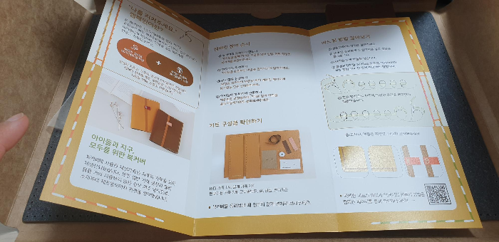 포장을 열면 이렇게 구성품이 들어 있다. 바느질용 실과 바늘, 펜꽂이를 만들 때 필요한 자투리 가죽이 두 장, 그리고 북 밴드로 활용될 갈색 고무줄이 하나. 책 겉을 감쌀 큰 가죽 한 장과 책날개로 쓰이게 될 작은 가죽 두 장. 구성품은 이것이 전부이다. 여기에 설명서가 들어 있기는 한데, 방법이 무척 간단하게 적혀 있기 때문에 다소 혼란이 올 수 있으므로 아예 설명서 하단에 있는 QR코드를 통해서 홈페이지에 들어가 다시 한 번 만드는 방법을 확인하는 편이 좋다.