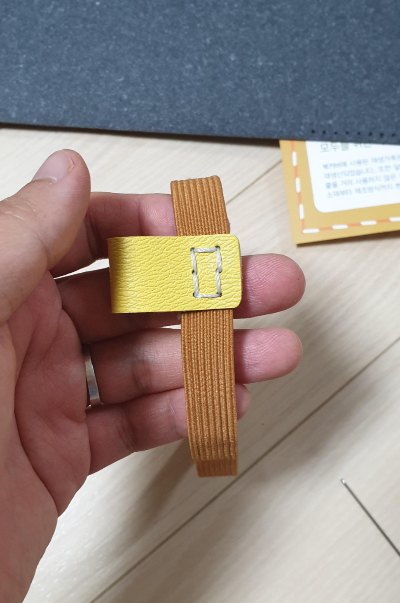 밴드에 달리게 될 펜꽂이용 자투리 가죽은 두 종류가 동봉되기 때문에, 원하는 색깔을 골라 만들 수 있다. 다 만든 밴드를 북커버에 잘 둘러 주고, 다시 예쁘게 종이봉투와 비닐봉투에 왔던 그대로 포장해서 보내면 된다.